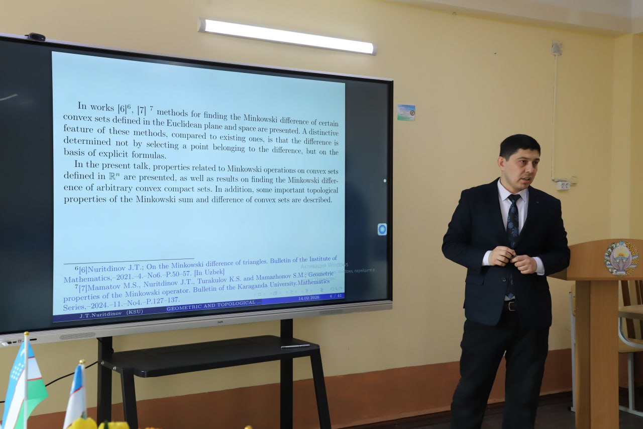 To‘rtinchi ma’ruza Qo‘qon davlat universiteti Matematika kafedrasi o‘qituvchisi J.T. Nuritdinov tomonidan “Qavariq to‘plamlarda Minkovskiy operatorlarining geometrik va topologik xossalari” mavzusida taqdim etildi. Unda qavariq analiz, geometrik strukturalar hamda topologik yondashuvlarning dolzarb jihatlari ilmiy muhokama qilindi.